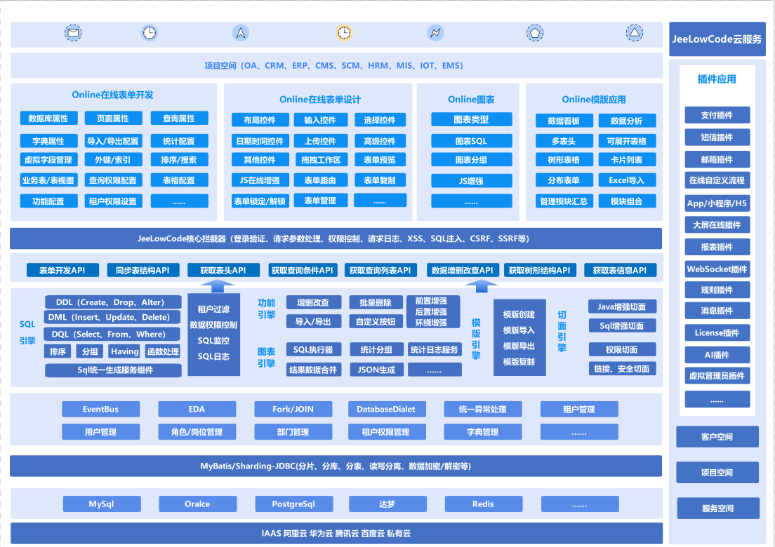 - 插件化架构:将权限控制、流程引擎等常用模块封装为独立插件,支持运行时热插拔,降低系统耦合。