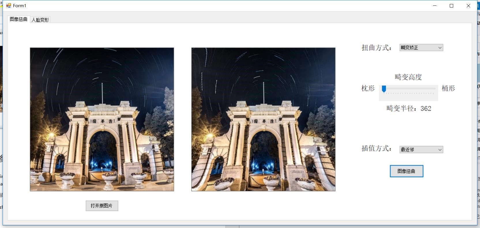 用户可以任意选择三种插值方式中的任意一种,也可以任意选择对图像进行哪种扭曲,且能很方便地设置扭曲参数。