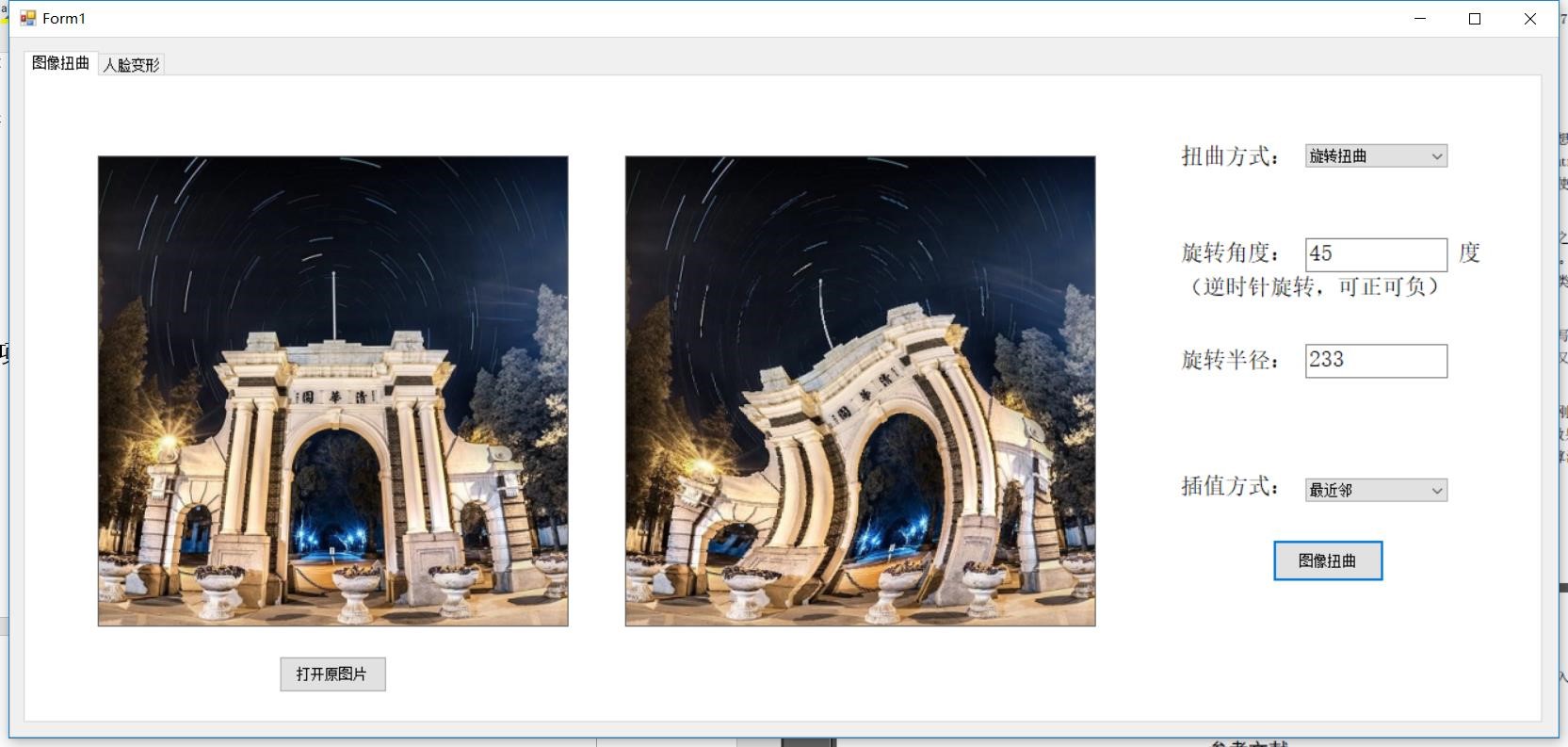必做任务要求用旋转扭曲和畸变扭曲两种方式对原图进行变形,本项目用目标图到原图的计算方式来实现。