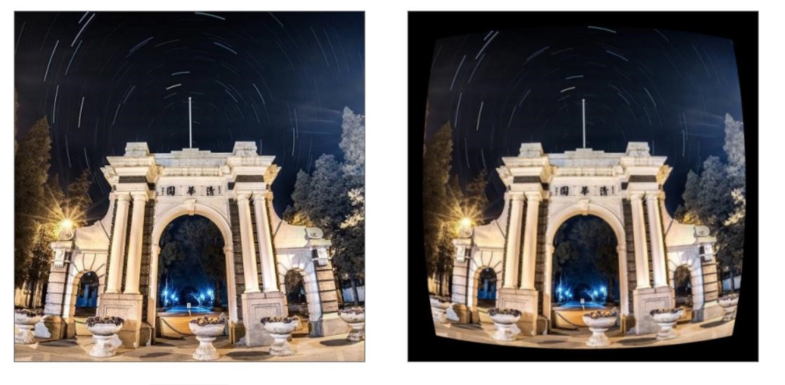 枕形畸变的算法大体与桶形畸变相同,只是坐标计算部分,需要将原图坐标和目标图坐标位置颠倒,所以计算公式变为: