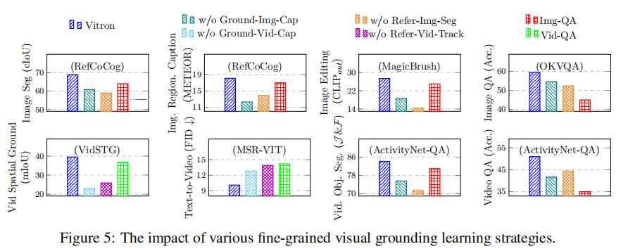 为验证各核心设计的必要性,VITRON 进行了三项关键消融实验: