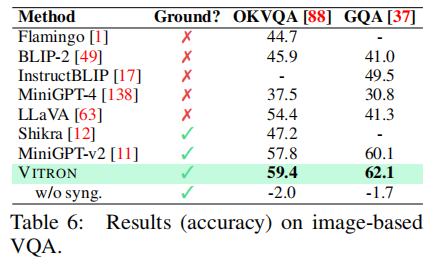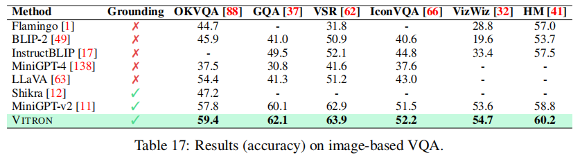 如表 6、表 17 所示,VITRON 在 OKVQA 数据集上准确率达到 59.4%,较 MiniGPT-v2(57.8%)提升 1.6%;在 GQA 数据集上达到 62.1%,较 MiniGPT-v2(60.1%)提升 2.0%。同时,对比无像素定位能力的模型(如 LLaVA、BLIP2),VITRON 的性能优势显著,证明细粒度定位对高层语义推理的促进作用。
