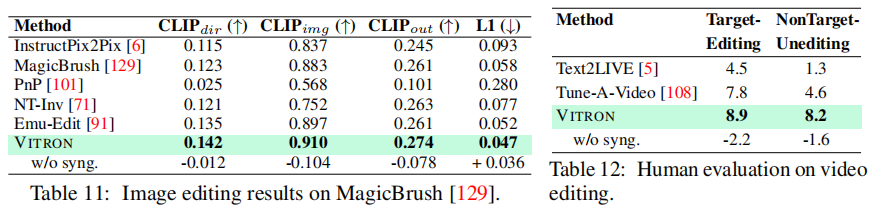 如表 11 所示,VITRON 在 CLIP dir(0.142)、CLIP img(0.910)、CLIP out(0.274)指标上均超越 Emu-Edit、MagicBrush 等专用编辑模型,L1 损失(0.047)最低,表明其编辑结果不仅与指令语义匹配,且视觉质量高、与原图风格一致性强。