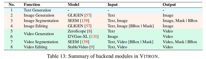 后端模块由一系列当前最优(SoTA)的视觉任务专家组成,根据 LLM 传递的指令与特征,执行具体任务并生成非文本输出。各专家模块的功能、输入输出如下表所示(表 13):