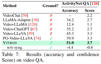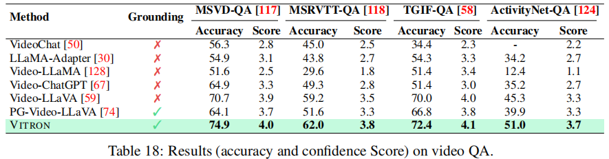 如表 7、表 18 所示,VITRON 在 ActivityNet-QA 数据集上准确率达到 51.0%,较 Video-LLaVA(45.3%)提升 5.7%,较具备定位能力的 PG-Video-LLaVA(39.9%)提升 11.1%;在 MSRVTT-QA 数据集上准确率达到 62.0%,较 Video-LLaVA(59.2%)提升 2.8%。这表明 VITRON 的视频时空定位能力能有效辅助语义理解,避免了 PG-Video-LLaVA 定位能力与 QA 性能脱节的问题。