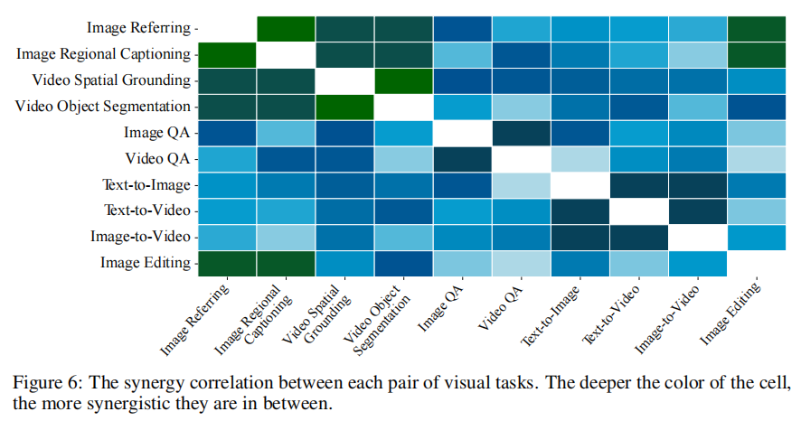 在所有任务中移除协同模块后,性能平均下降 1.0-4.4%(如表 2-12 的 w/o syng. 列)。同时,任务间协同热力图(图 6)显示,依赖细粒度特征的任务(如图像分割、视频跟踪、图像编辑)间的协同效应更强,例如图像分割与图像编辑的协同系数最高,证明任务不变特征能在同类细粒度任务中高效共享。