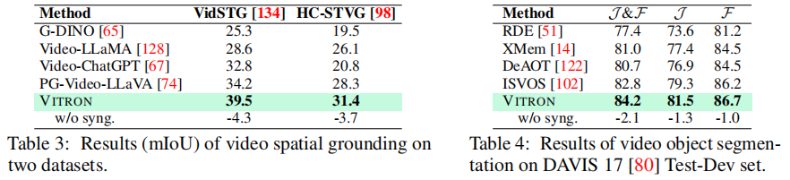如表 3 所示,VITRON 在 VidSTG 数据集上的 mIoU 达到 39.5%,较当前最优的 PG-Video-LLaVA(34.2%)提升 5.3%;在 HC-STVG 数据集上达到 31.4%,较 PG-Video-LLaVA(28.3%)提升 3.1%。这表明 VITRON 的视频时空定位能力显著优于专用视频 LLM。