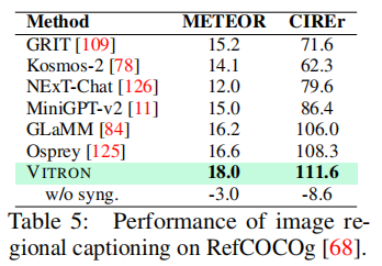 如表 5 所示,VITRON 在 METEOR(18.0)与 CIREr(111.6)指标上均超越 Osprey(METEOR 16.6、CIREr 108.3)、GLaMM(METEOR 16.2、CIREr 106.0)等模型,尤其 CIREr 指标提升 3.3,表明其能更精准地生成与区域匹配的细粒度描述。