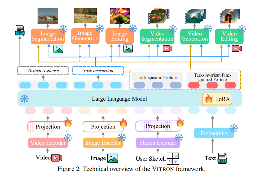 VITRON 采用经典的 "前端编码器 - 核心 LLM - 后端解码器" 架构,但在各模块设计上进行了深度优化,确保全模态、全任务能力的高效集成。其整体架构如图 2 所示:
