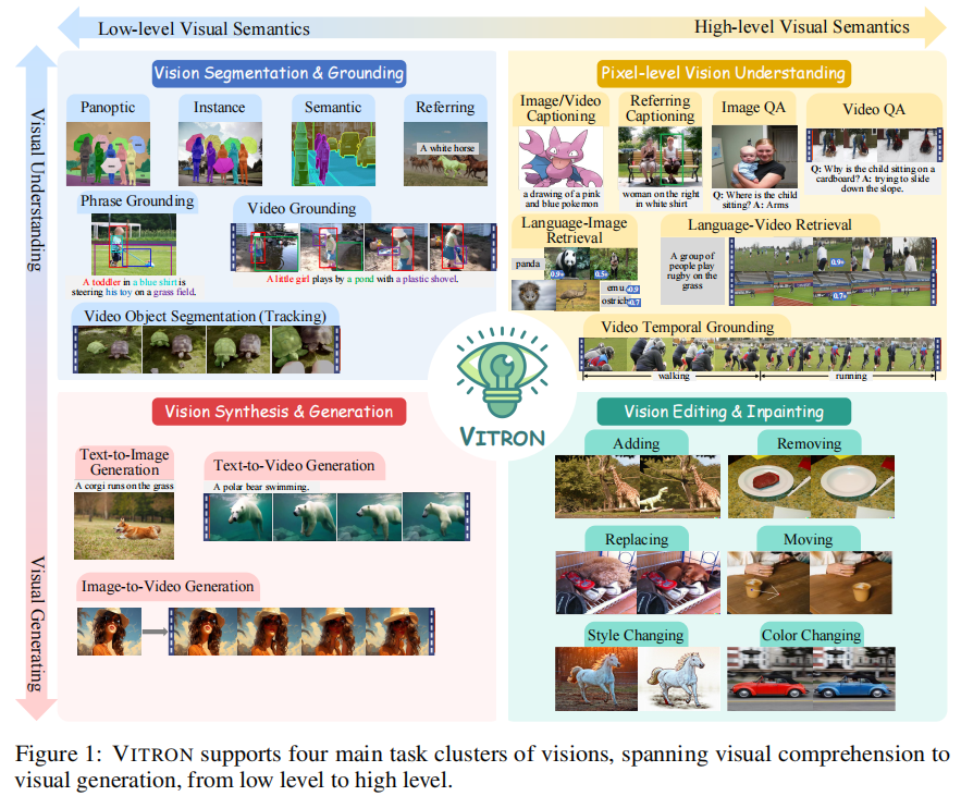 在多模态大语言模型(MLLM)领域,现有模型常面临图像与视频处理分离、任务覆盖不全面、细粒度理解不足等挑战。而 VITRON 的出现,以 "统一像素级视觉大语言模型" 为定位,实现了对图像与视频的理解、生成、分割、编辑四大核心任务集群的全覆盖,为统一多模态 AI 提供了新范式。