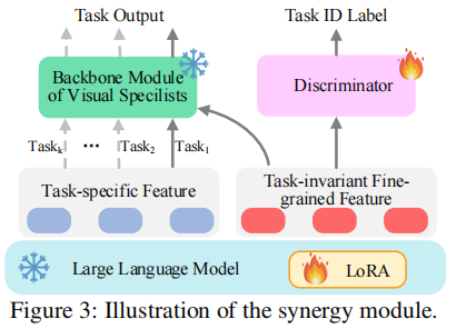 - 对抗训练:引入第三方任务判别器,其目标是仅通过任务不变特征判断当前任务类型。LLM 则通过优化使判别器无法准确识别任务,从而促使任务不变特征提纯为通用、可共享的细粒度视觉特征。