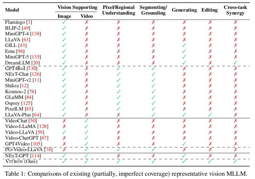 文中通过多维度对比当前主流视觉多模态大语言模型(Vision MLLM)的能力,清晰凸显了 VITRON 的核心优势(表1)。