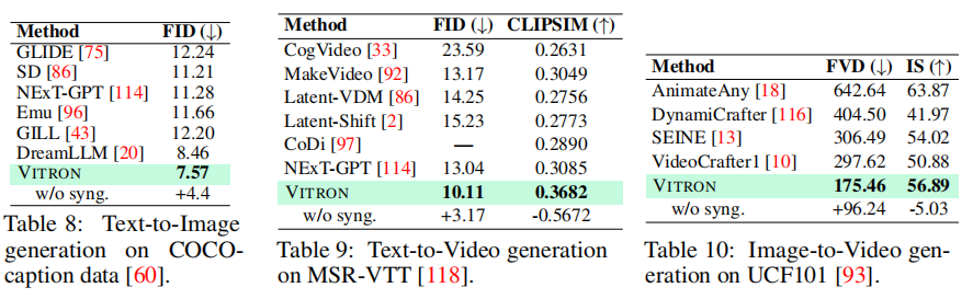 如表 8 所示,VITRON 的 FID 达到 7.57,低于 DreamLLM(8.46)、NExT-GPT(11.28)等模型,甚至优于专用扩散模型 SD(11.21)。移除协同模块后,FID 上升 4.4,证明跨任务协同能提升生成质量。