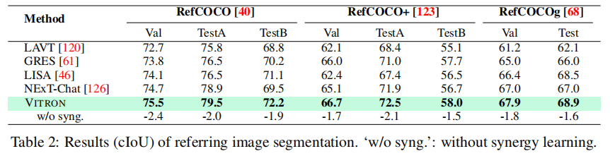 如表 2 所示,VITRON 在 RefCOCO 的 TestB、RefCOCO + 的全部分集、RefCOCOg 的全部分集上均超越 NExT-Chat 等基线模型,尤其在 RefCOCOg 的 Test 集上,cIoU 达到 68.9%,较 NExT-Chat 提升 1.9%。当移除协同模块(w/o syng.)后,性能平均下降 1.5-2.4%,验证了跨任务协同的有效性。