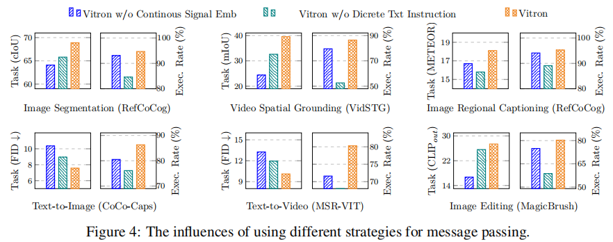 对比 "仅离散文本指令""仅连续信号嵌入""混合机制" 三种方案,在 6 项任务上的性能如图 4 所示。结果显示,混合机制在任务性能(如图像区域描述的 METEOR、视频空间定位的 mIoU)与模块执行成功率上均最优。其中,文本指令主要提升执行成功率(确保模块调用正确),连续特征主要提升任务性能(提供细粒度模态信息),二者协同实现 "调用准确 + 执行精准"。