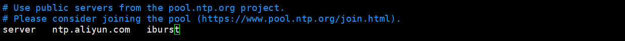 找到以 pool 或 server 开头的行,注释掉默认的,并添加阿里云NTP服务器。