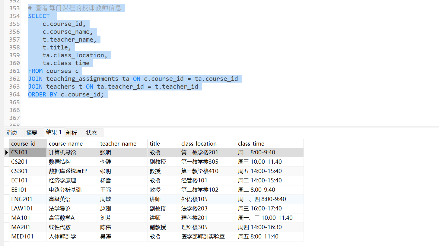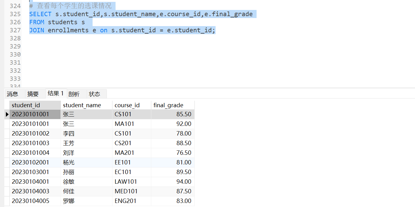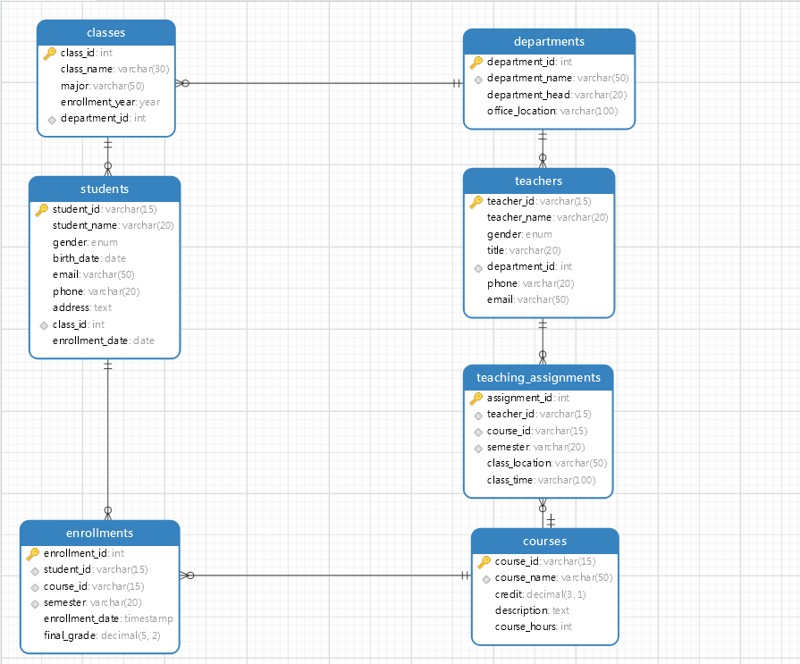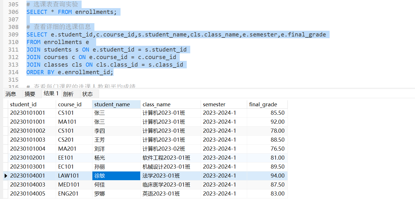 - 选课与成绩:学生选修了哪些课程,以及对应的成绩。