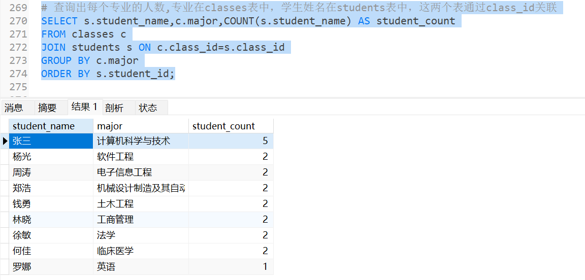 # 查询出每个专业的人数,专业在classes表中,学生姓名在students表中,这两个表通过class_id关联,按照专业进行分组
