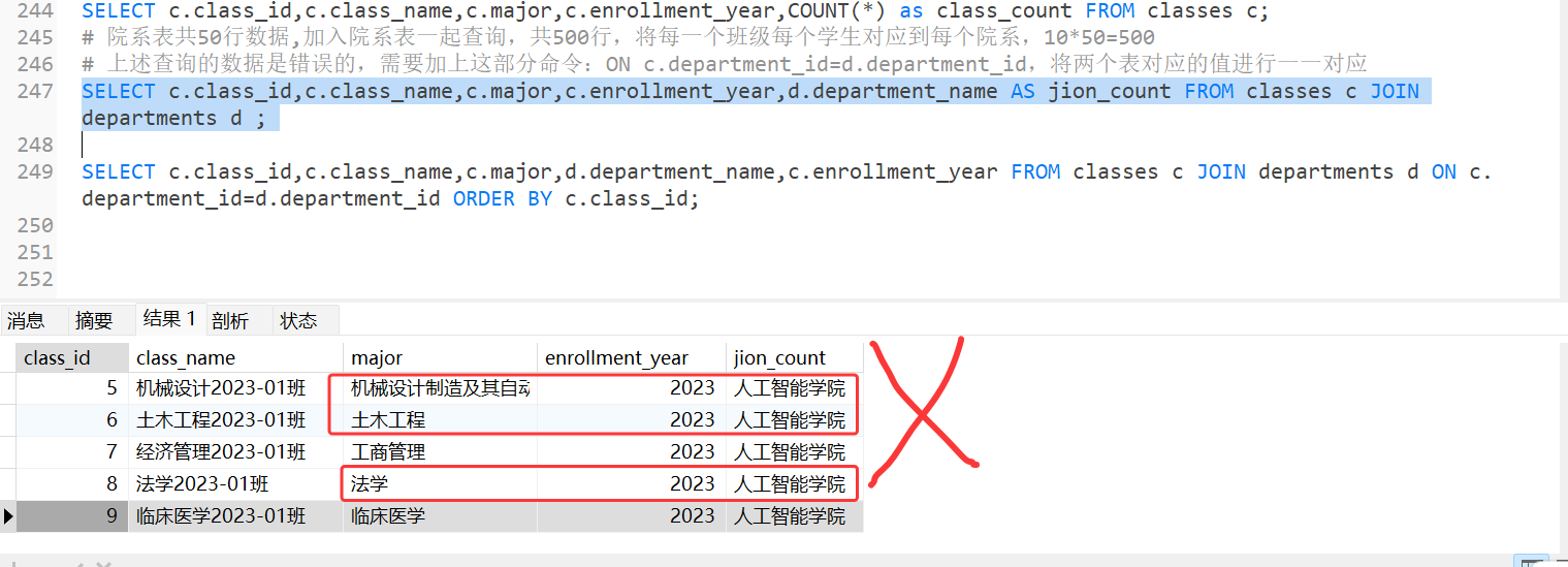 # 上述查询的数据是错误的,需要加上这部分命令:ON c.department_id=d.department_id,将两个表对应的值进行一一对应