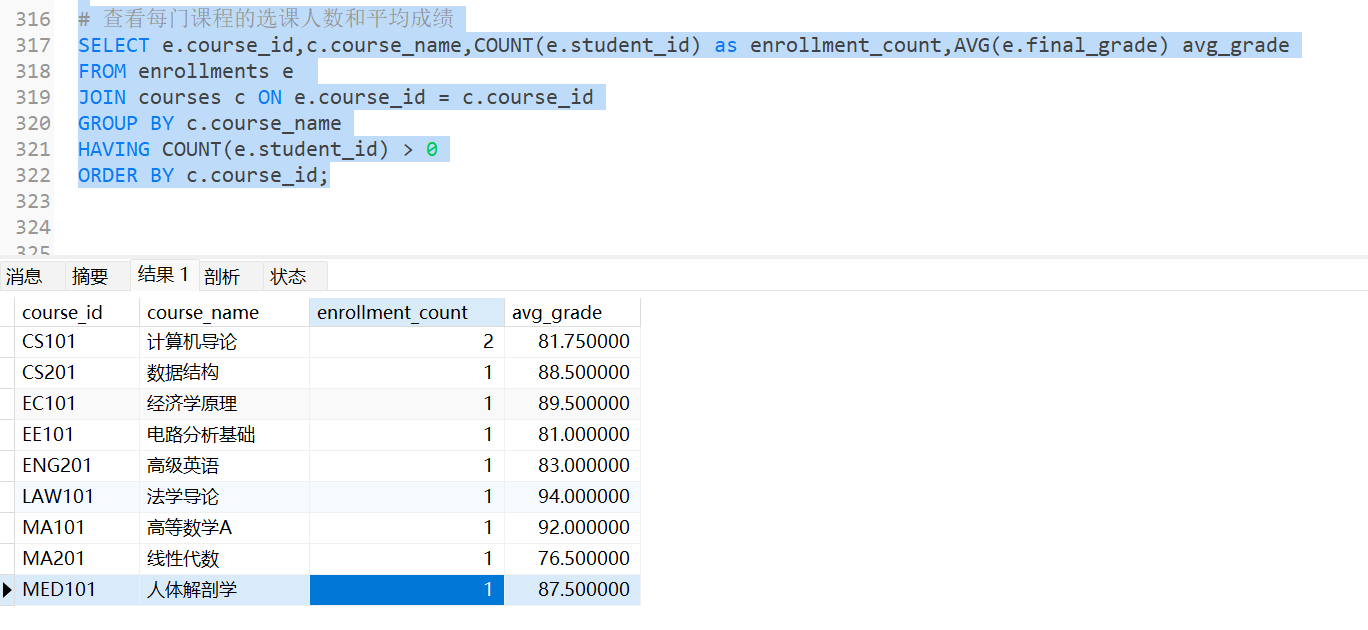 SELECT e.course_id,c.course_name,COUNT(e.student_id) as enrollment_count,AVG(e.final_grade) avg_grade