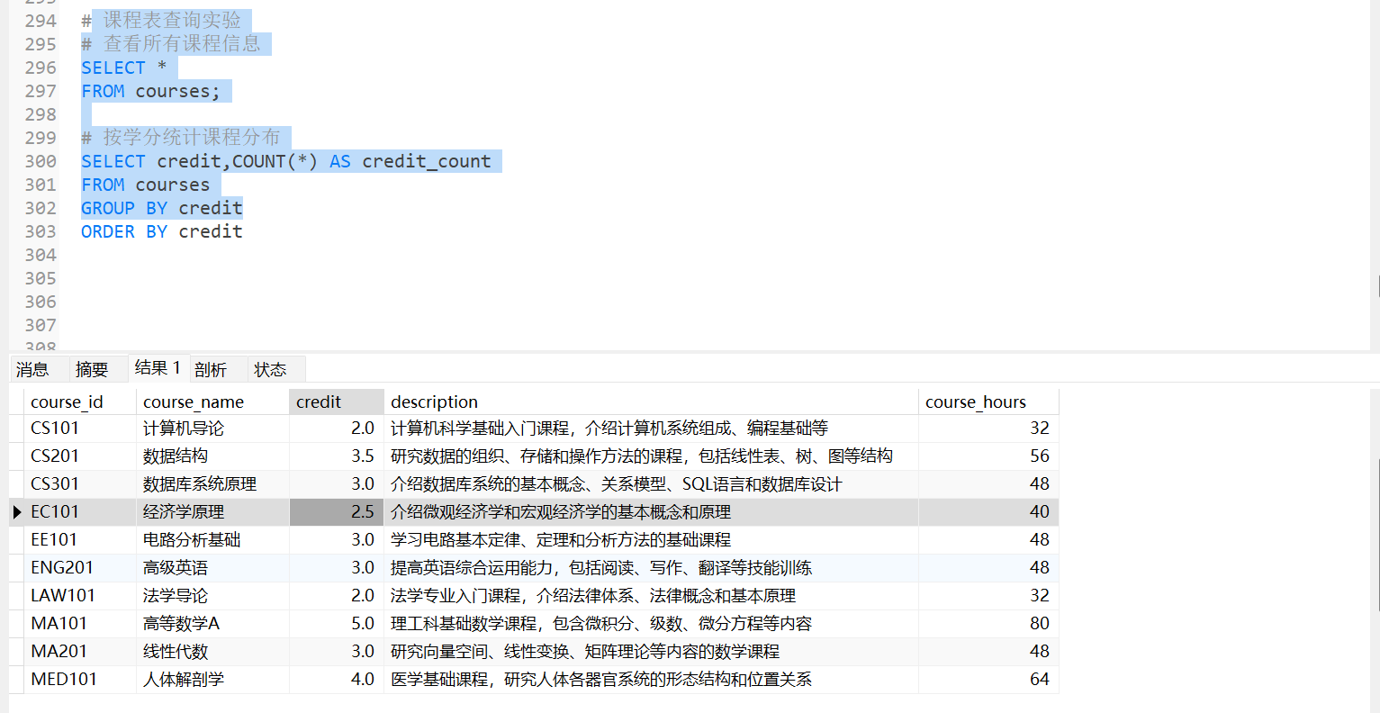 - 课程信息:课程号、课程名、学分、课程描述等。