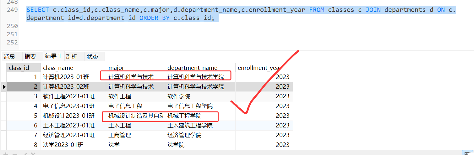 SELECT c.class_id,c.class_name,c.major,c.enrollment_year,d.department_name,COUNT(*) AS jion_count FROM classes c JOIN departments d ;