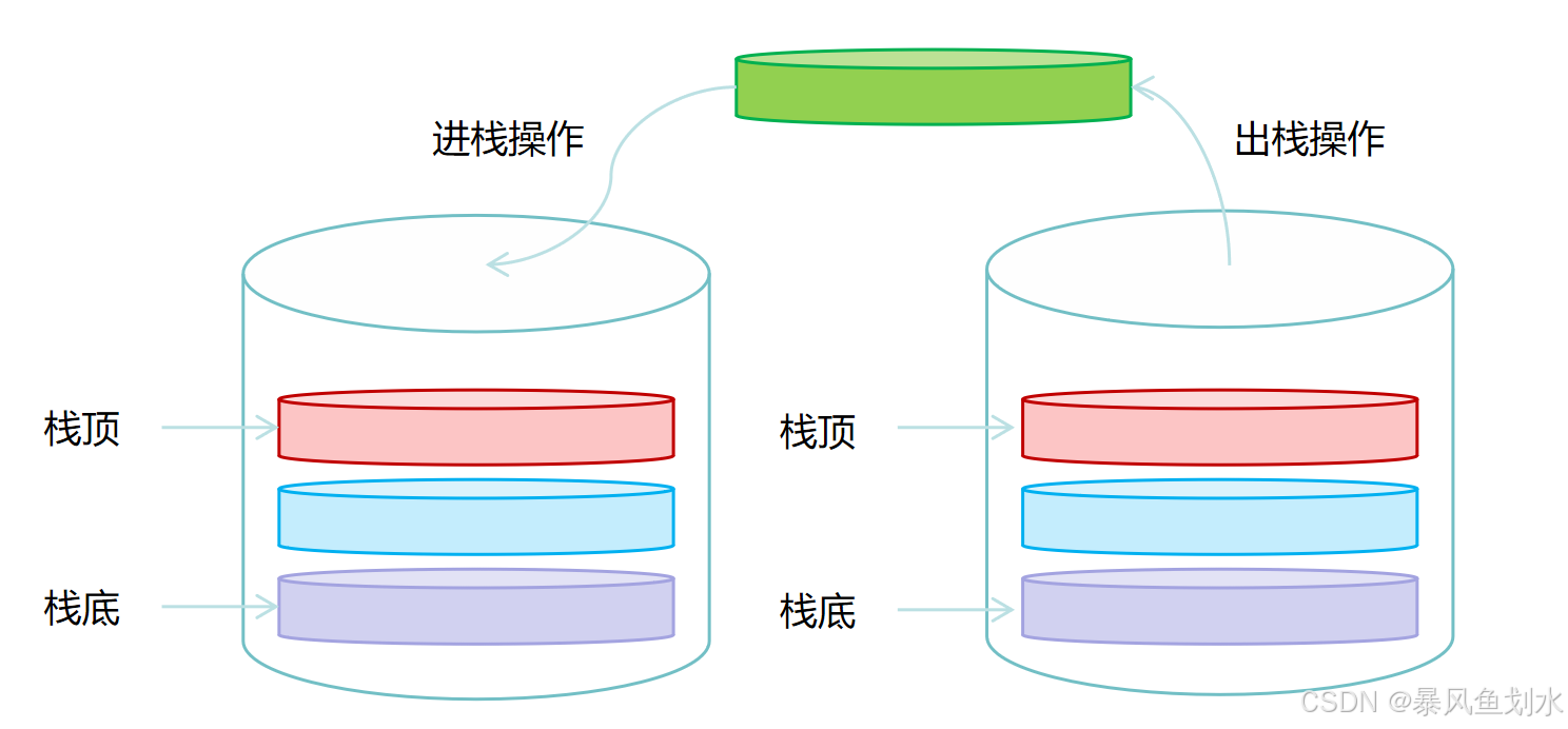 栈的操作实际上和洗盘子的过程是类似的,洗盘子的过程中,会拿出待清洗那一摞盘子的最顶端的哪个盘子,清洗之后将其放在已清洗区域,这对于待清洗盘子来说是出栈,对于已清洗区域来说,是入栈(进栈),具体的过程可以看下面的图示: