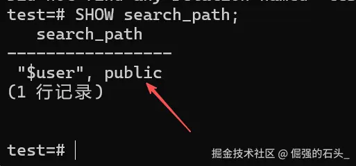 原因 :模式搜索路径未包含目标模式(如 test_schema 不在搜索路径中),数据库默认在 public 模式查找表。