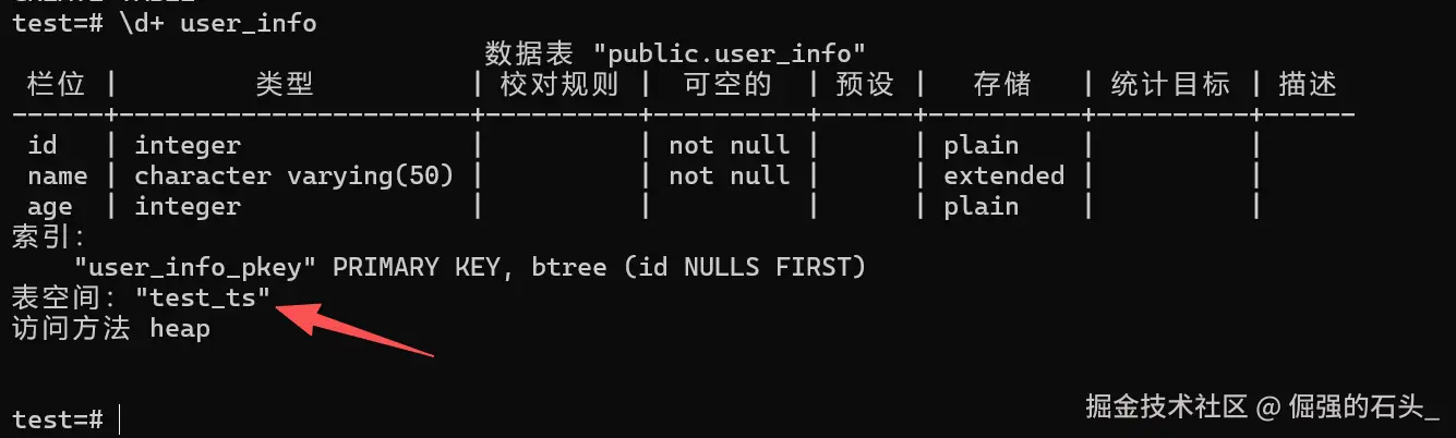 创建表后,可通过 \d+ 命令查看表的详情,确认表空间是否正确: