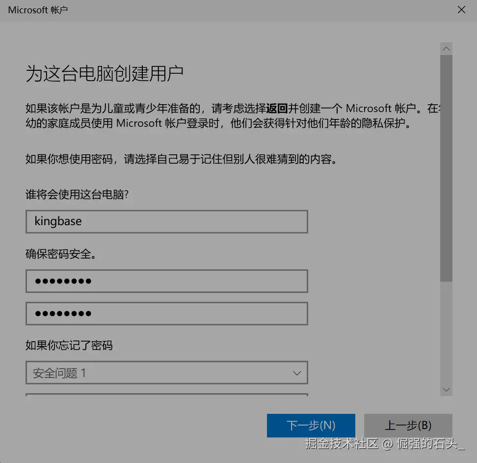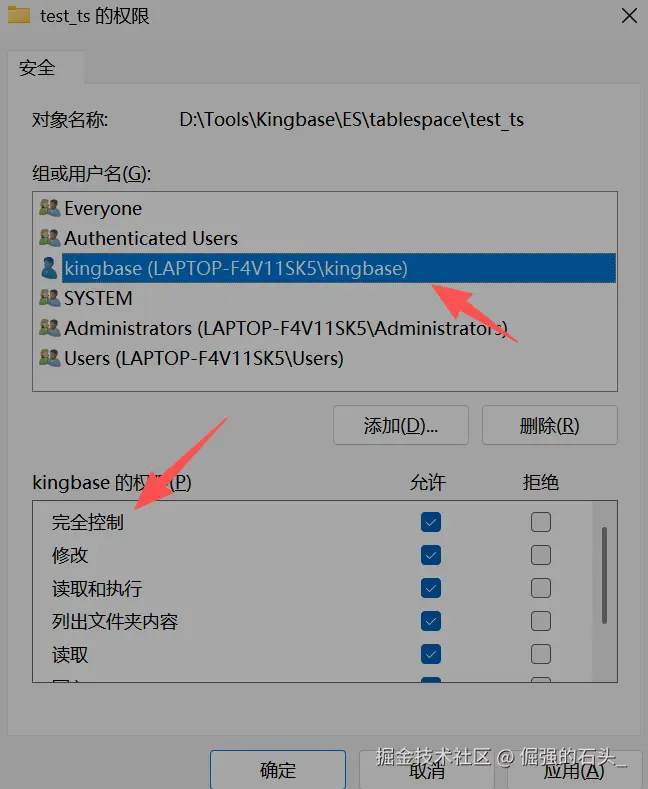 kingbase用户(若未创建,需先在 "计算机管理" 中创建),并授予 "完全控制" 权限。