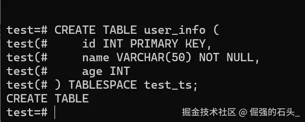 CREATE TABLE,这表明表已在test_ts表空间创建成功。