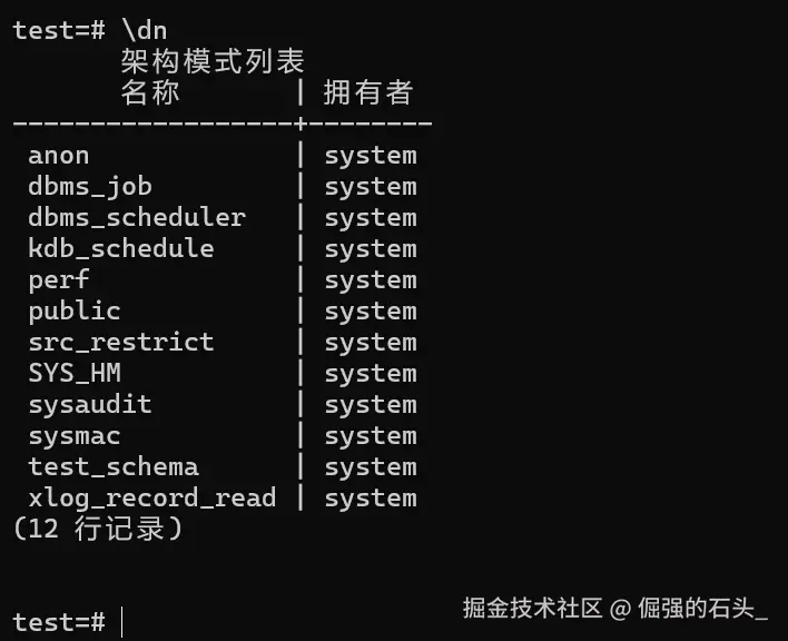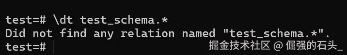 \dt test_schema.*:显示test_schema模式下的所有表;- 若模式下无表,会提示