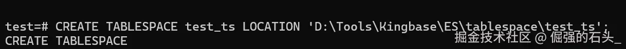 sqlCREATE TABLESPACE test_ts LOCATION '/opt/kingbase/tablespace/test_ts';若为 Windows 系统,命令如下(路径用