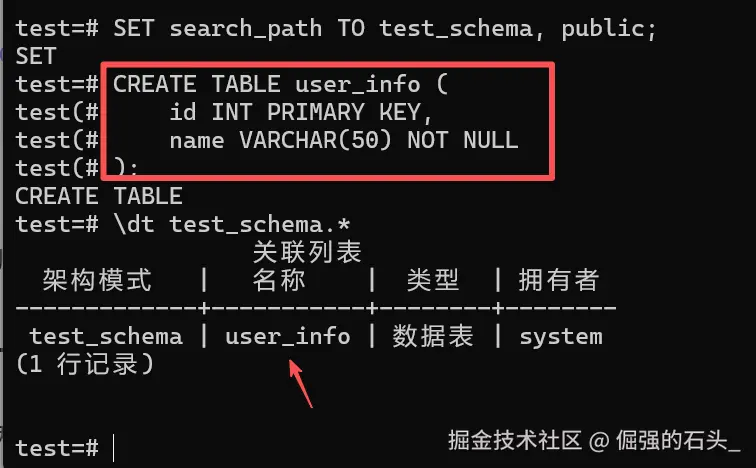 修改搜索路径后,直接创建表会默认存放在 test_schema 模式: