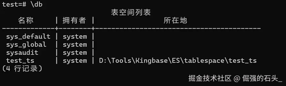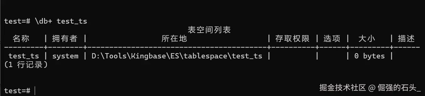 /分隔):sqlCREATE TABLESPACE test_ts LOCATION 'D:\Tools\Kingbase\ES\tablespace\test_ts'; -