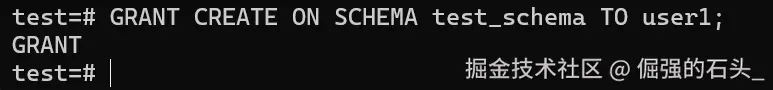 授予后 user1 可在 test_schema 下创建表,但不能修改其他用户的表。