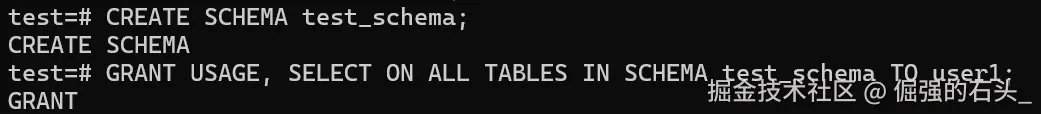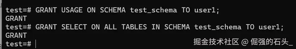 示例 1:给 user1 授予 test_schema 的 "访问权限" 和 "表查询权限":