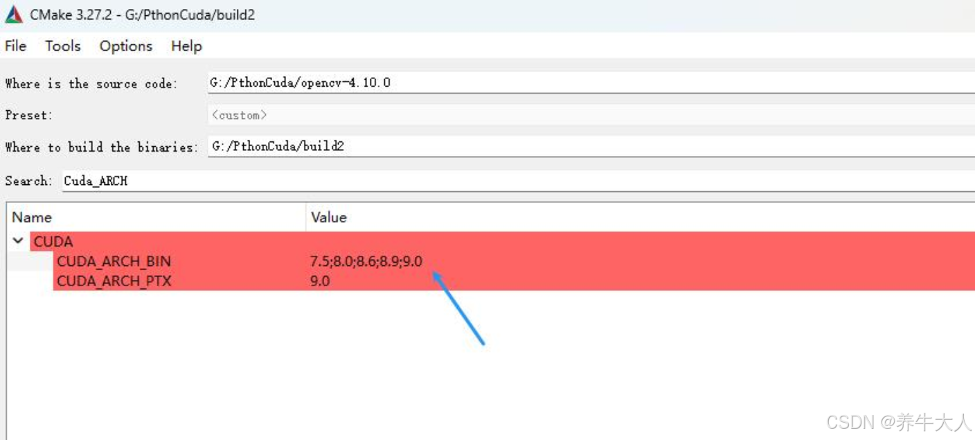 以下是显卡算力设置,其中CUDA_ARCH_BIN需要设置成显卡的算力,CUDA_ARCH_BIN就默认