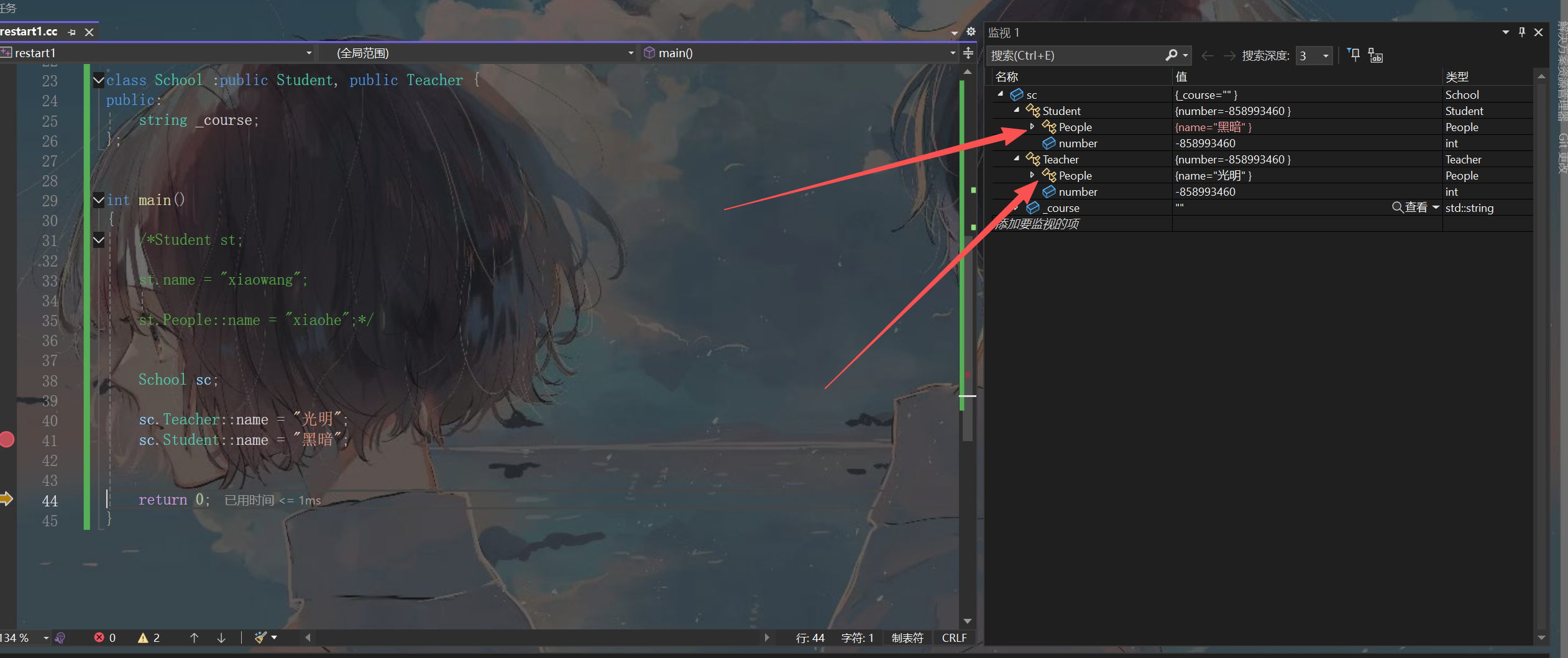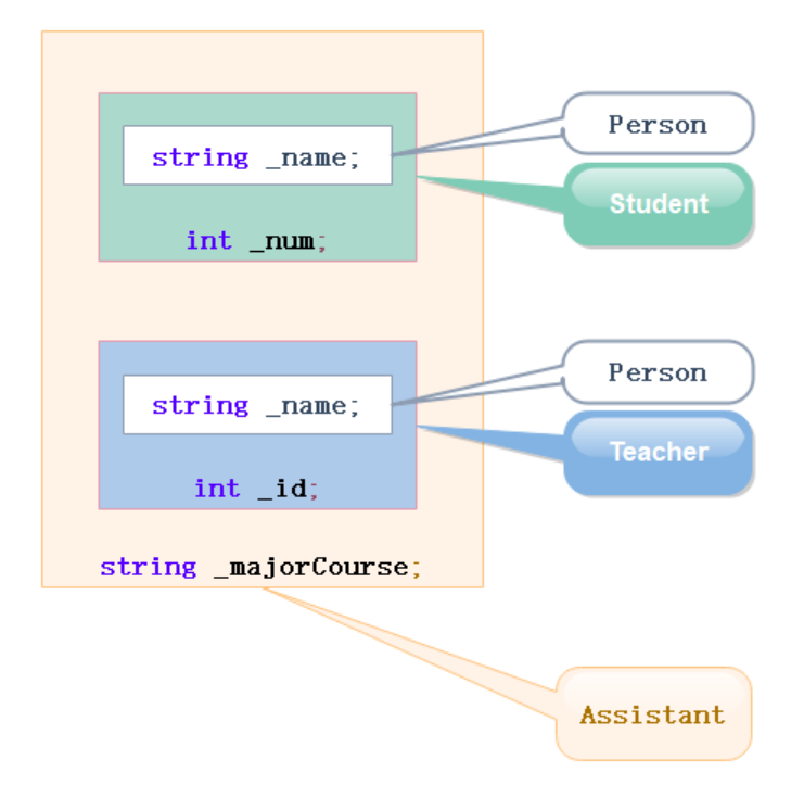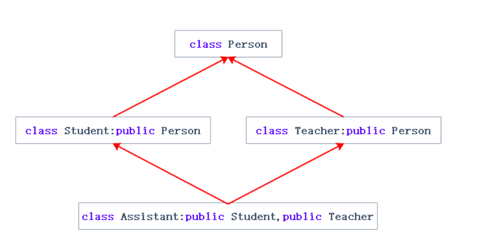 菱形继承是多继承的一种特殊情况,但是会导致一系列的问题:数据冗余和二义性问题,在在Assistant的对象中Person成员会有两份。