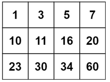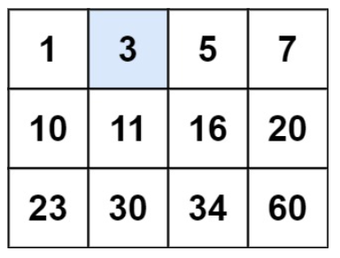输入:matrix = [[1,3,5,7],[10,11,16,20],[23,30,34,60]], target = 3