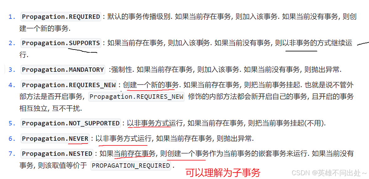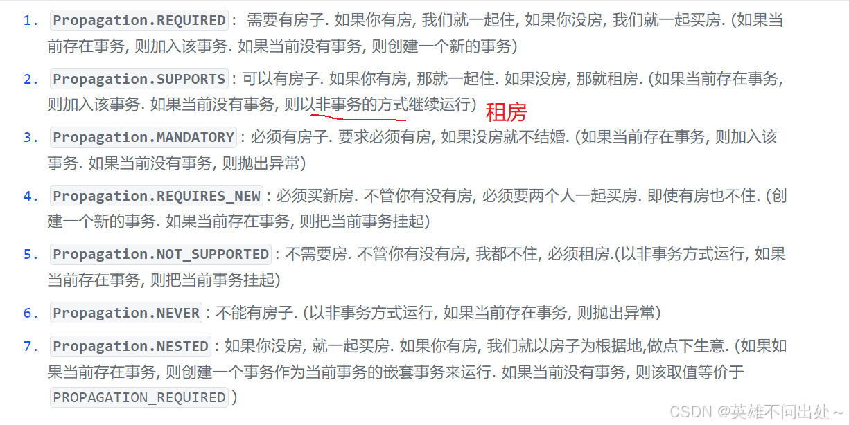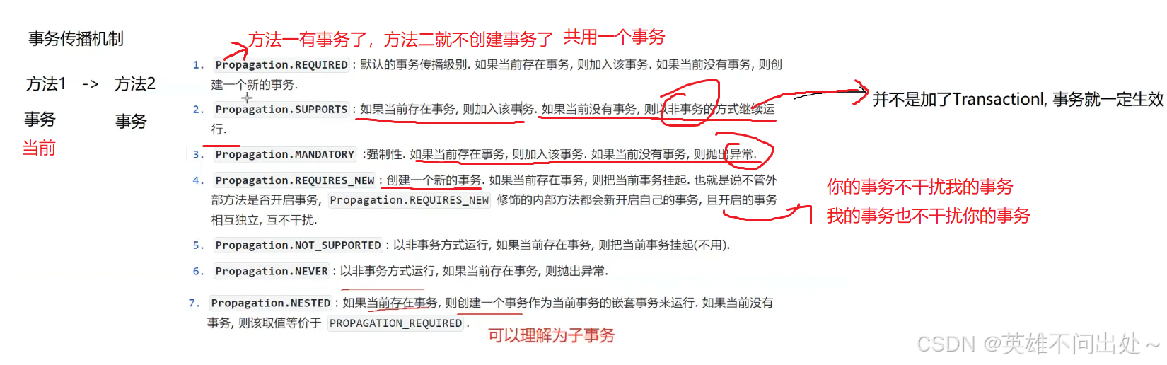 - 事务传播机制: 多个事务方法存在调用关系时, 事务是如何在这些方法间进行传播的