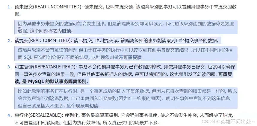 - Isolation.SERIALIZABLE : 串行化, 对应SQL标准中 SERIALIZABLE