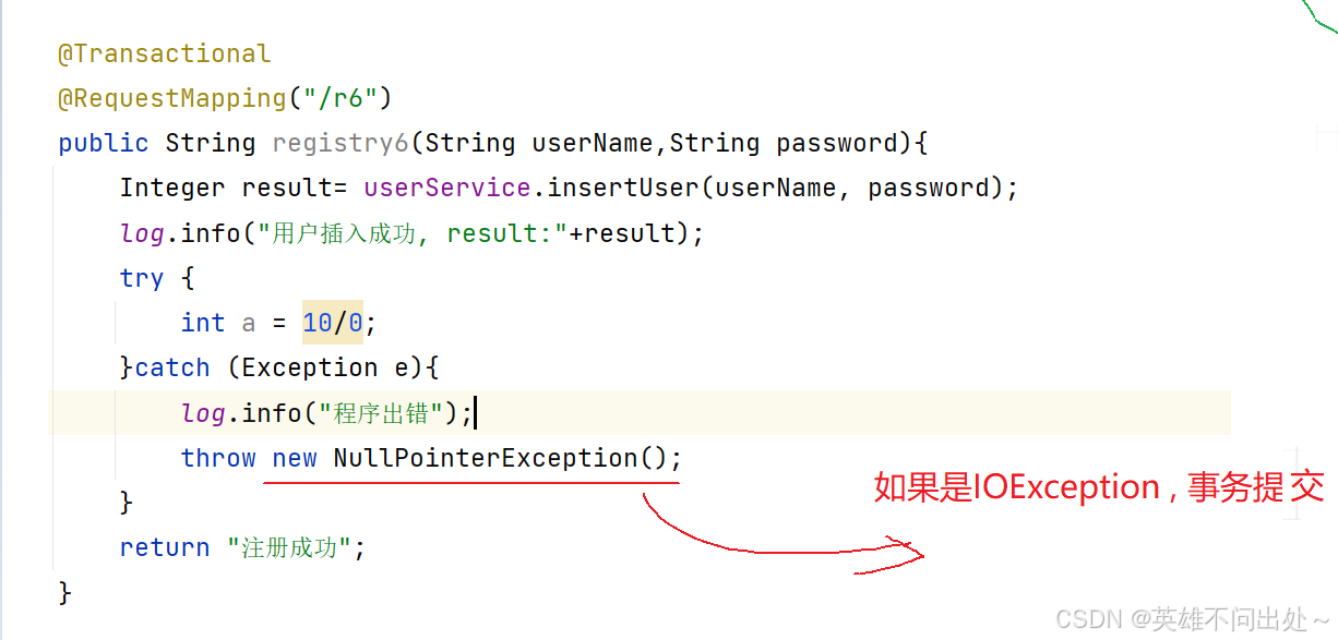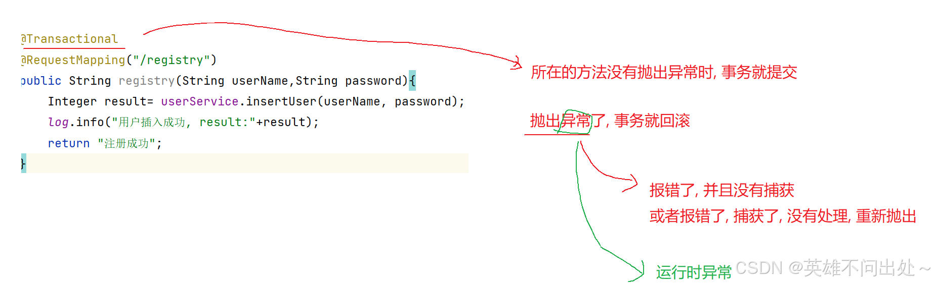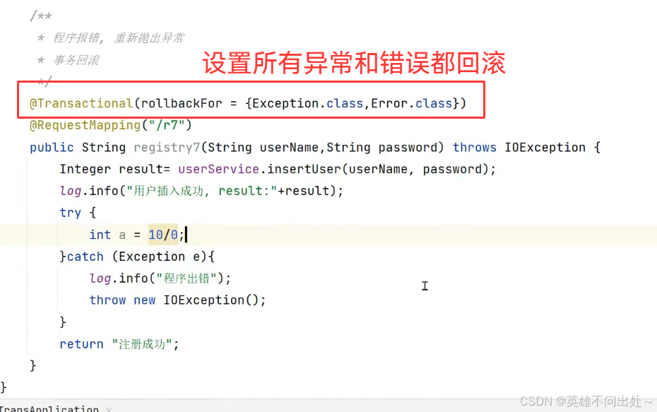 @Transactional只关心你是否解决掉异常了,不关注你的内部代码,没有解决掉异常就会回滚