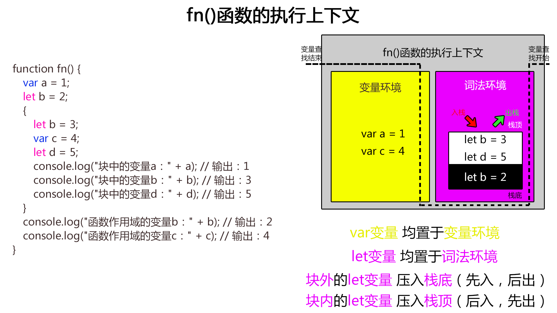 - 当块内的代码执行完毕后,位于词法环境栈顶的let变量将依次弹出,最终只剩下块外的let变量。