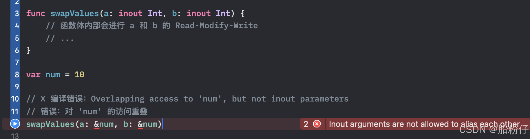 我们都知道, 在 swift 里 inout 参数是用来修改实参的. 但其实 inout 参数的使用是要遵循"数据独占性"的, 要不然编译器会报错或警告.