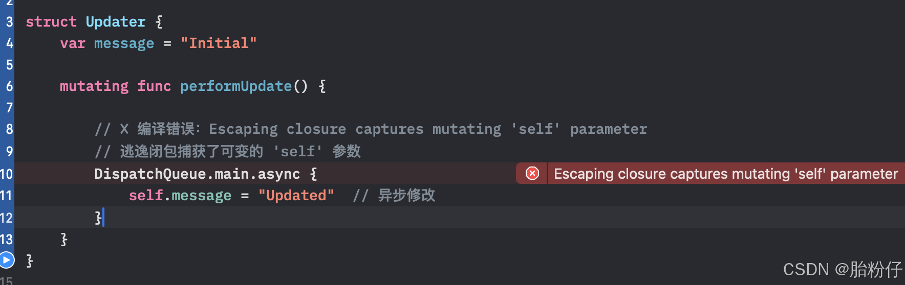 - mutating 方法实际会把 self 以 inout 的形式传进来, 因此 mutating 方法会对 self 要有数据独占性. 而如果如图 3 所示在逃逸闭包里修改 self, Swift 会认为你会在调用其他 mutating 方法时执行这个闭包, 那么对其他 mutating 方法而言就做不到 "数据独占" 了 (因为其他 mutating 函数里可能会出现同时向同一块内存写入的情况).