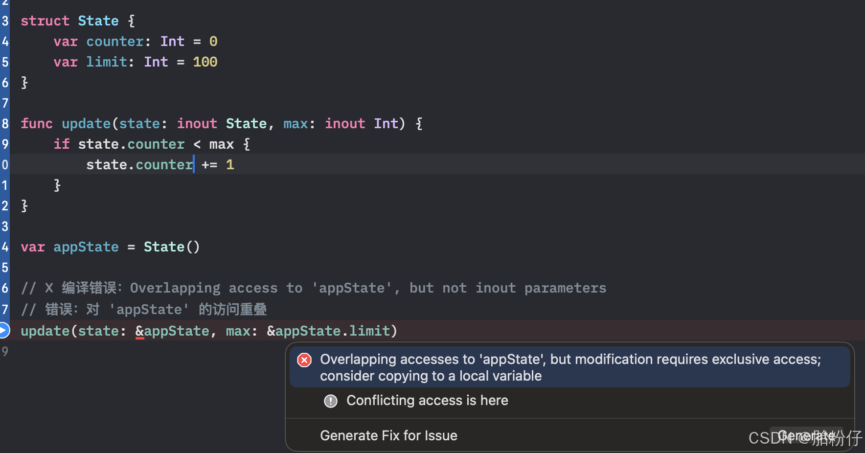 因为 state 传的是整块 appState 的内存, 而 max 传的是 appState 里的 limit 那块内存, 这两块内存是重叠了的, 所以 Swift 会怀疑你会对重叠的那部份内存边读边写, 于是就会报访问重叠 (overlapping accesses) 的错误.