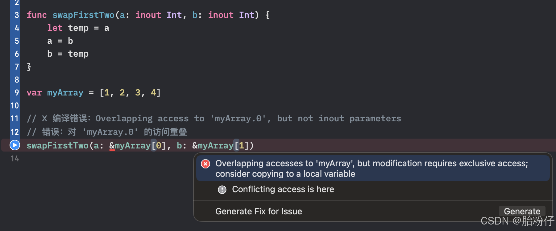 访问重叠就是给多个 inout 参数传同一块连续内存. 这样做会导致 Swift 认为你在这个函数里同时对这块连续内存多次写入, 或边写边读, 于是 Swift 就认为你在破坏数据独占.
