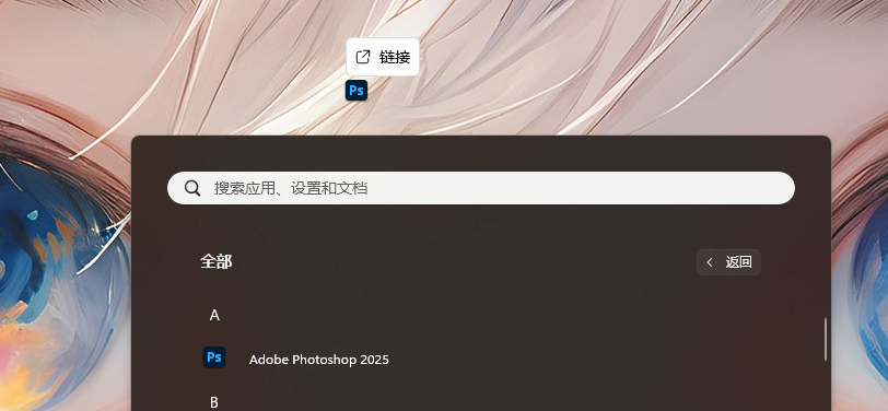 8.创建桌面快捷方式:点击桌面任务栏中的【开始图标】>点击【所有应用】将【Adobe Photoshop 2025】图标拖到电脑桌面