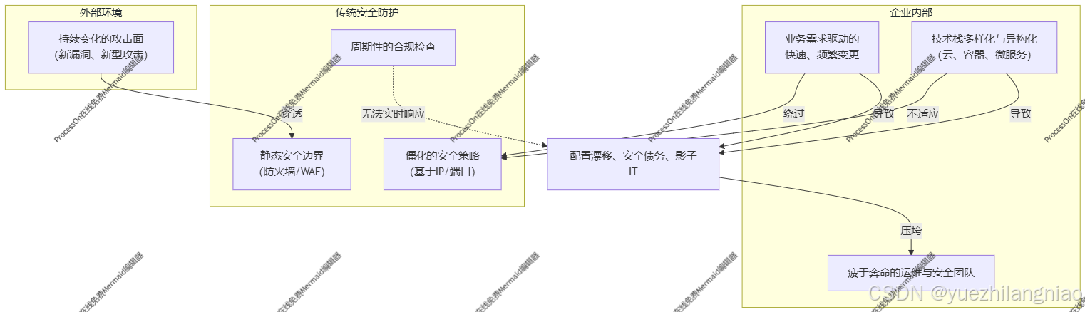 图解:外部的动态攻击和内部的动态变化,如同洪流,轻松绕过了或冲垮了静态的安全设施。运维和安全团队站在洪流中,试图用沙袋(临时策略)去堵,最终精疲力尽,漏洞百出。